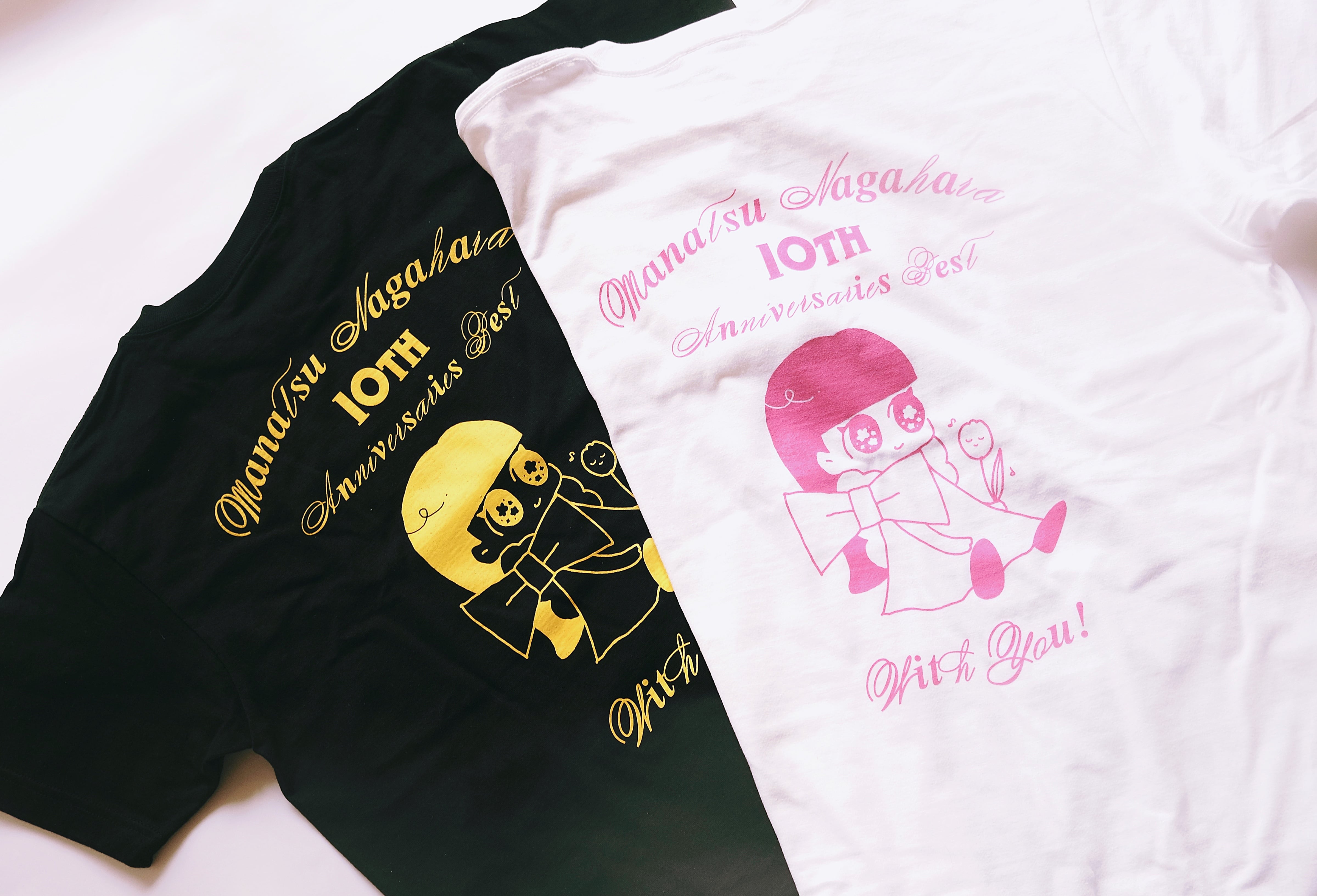 「花束掲げて10周年」ツアーグッズ!おねえちゃんが描いたまなっちゃんの似顔絵Tシャツ。バックプリントです。 Tシャツは大きめサイズのS。夏のお友達にどうぞ!