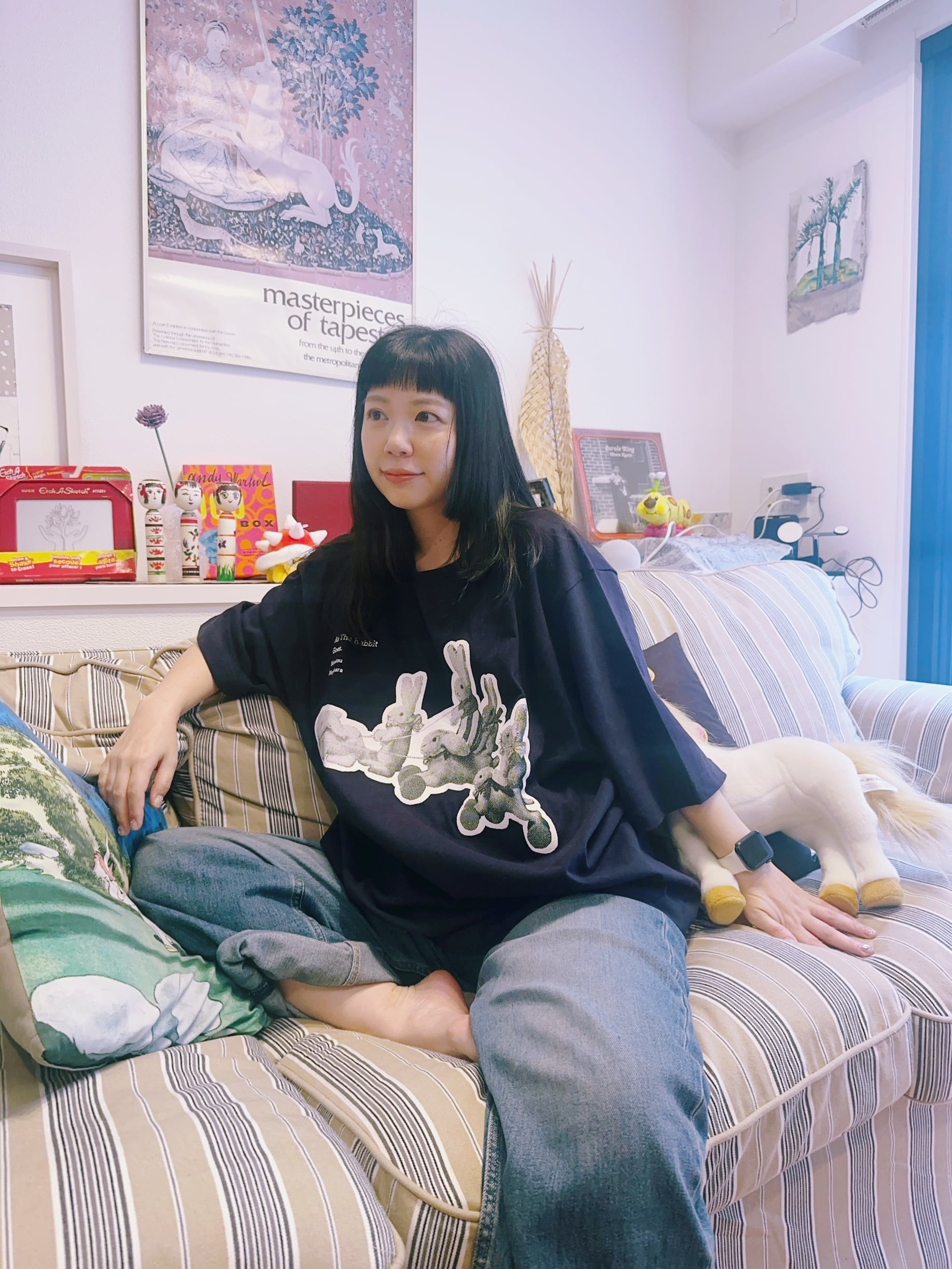 おもちゃのうさぎが大行進しているデザインです。ぶかっと着られるTシャツは、いつだって味方になってくれる最高のお友達!